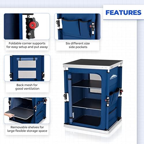 UNIQUE DESIGN: Eagle Peak camping kitchen table features a large 23.6 x 18.9 inch top surface area, center storage, and six large and small side pockets. The center zippered compartment offers a large accessible storage space to help organize your camp and protect your food from the bugs and animals. The versatile 3-tier storage organizer can be changed from 1 to 3 levels customized to your needs.