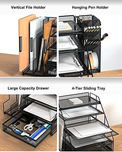Egepon Office Desk Organizer with Vertical File Folder Holders 5-Tier Paper Letter Tray with Drawer and Hanging Pen Holder Multifunction Office Supplies and Accessories for Office School Home