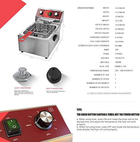 LARGE CAPACITY – With 10L(10.5QT) tank, a lid and a removable extra-large frying basket is easy to use complete with cool touch handle prevents excess heat transfer, so even on busy shifts you can keep working without risk of burns or discomfort. Additionally, the front hook is compatible with most fryers, making it easy to hang the basket up to drain the oil quickly. Oil tank, lid and basket are dishwasher safe