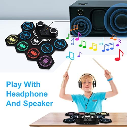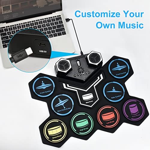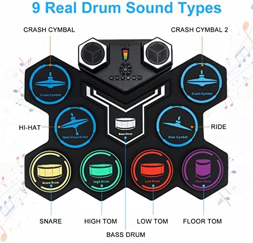 Realistic Drum Sound,Our kid drums pad has built-in stereo speakers,making each of the nine touch-sensitive drum pads capable of producing a wide range of realistic drum audio