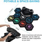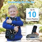Drumming On The Way: Our kids drum set has built-in 1200mAh rechargeable battery, lasting up to 10 hours play per charge. It is easy to store, doesnt take very much space so that you can roll it up, pack it in your bag to take it anywhere for outdoor parties, choir practice, studio, music/drum lessons