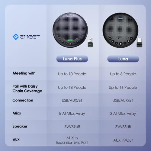 [Easy Set up & Broad Compatibility] The EMEET Luna Plus conference speakerphone can connect to various devices in seconds using USB 2.0, and Bluetooth 5.3, without the need for any drivers. Compatible with Windows, Mac OS, and Android, the Bluetooth speaker works with mainstream meeting platforms such as Zoom, Microsoft for Teams, Skype for Business, and more. Experience effortless and efficient conference calls with the Luna Plus.