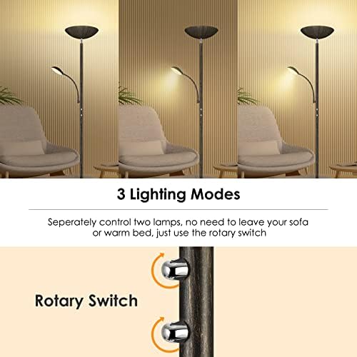 All in One Integrated Adjustable Mother-Daughter lamp; This modern floor lamp features a 90° tilt lamp head and 360° adjustable gooseneck lamp; Unlike other ordinary lamps, this bright LED floor lamp can adjust brightness freely via the unique 2-rotary switches; Facedown to be a floor lamp for reading and working; Face outwards to be a 73 Inch tall torchiere floor lamp for celebrating; Face upwards to be a dimmable floor lamp for relaxing; The surprise of this lamp is waiting for you to explore