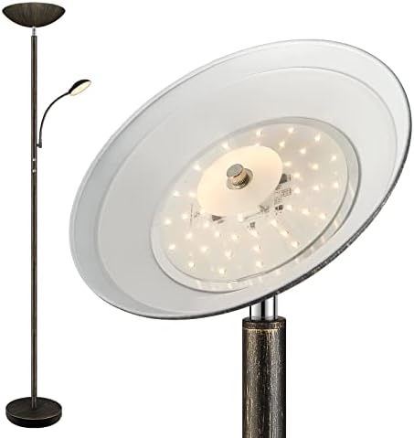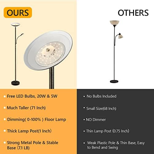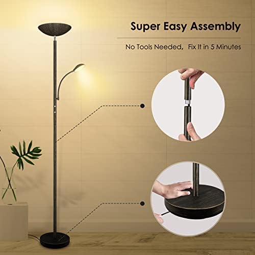 Premium Quality & Easy Assembly; Made from metal body and featuring a 10in heavy-weighted base, this torchiere floor lamp ensures better stability and safety, which won’t tip over easily; Coming with premium LED beads, the floor lamp will not overheat after a long time use; Besides, to release worries about installing, this 73in tall floor lamp stands pre-installed LED plates and a simple tube pole, you only need to screw all parts together; Note: please follow the installation video on the page