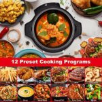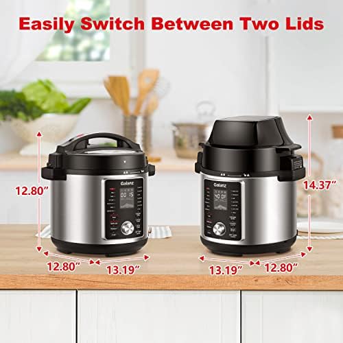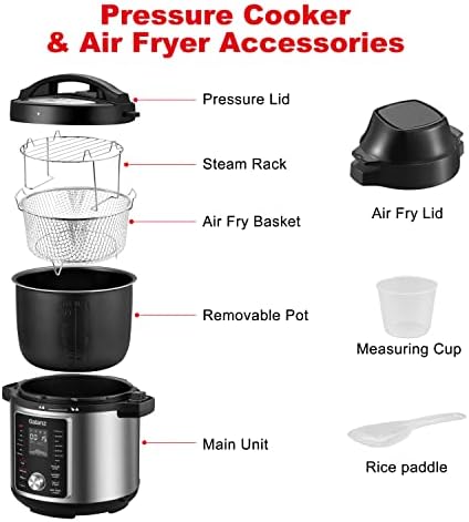 [Ideal Size & Accessories] This product measures 13.19″W*12.80″D*12.80″H with the pressure lid and 13.19″W*12.80″D*14.37″H with the air fry lid. Accessories included are: Air fry lid, pressure cook lid, measure cup, rice paddle and air fry kit