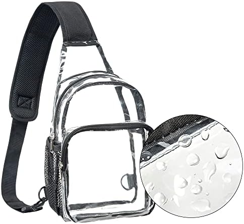 Water Resistant & Sturdy: The clear shoulder backpack made of heavy duty transparent PVC waterproof material, which can keep things safe and dry at all times, except submerged in water. And our clear sling bag all seams are reinforced with double stitches which makes them avoid tearing and hold heavy loads easily
