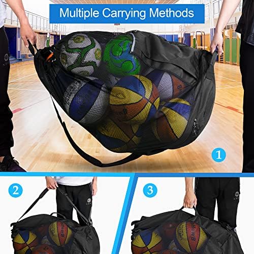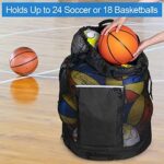 The mesh ball bag is measured at 25″x37″, which holds up to 24 soccer balls (size 5), 18 basketballs (size 7) or 20 basketballs and soccer balls mixed in half.