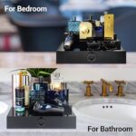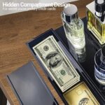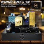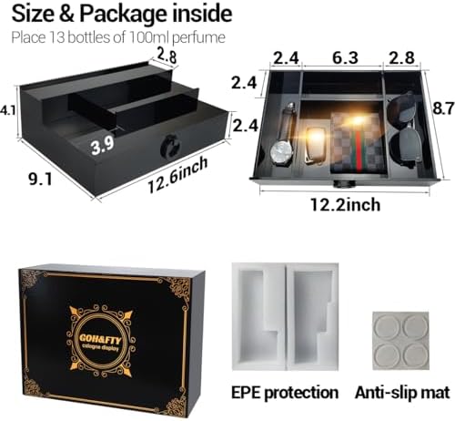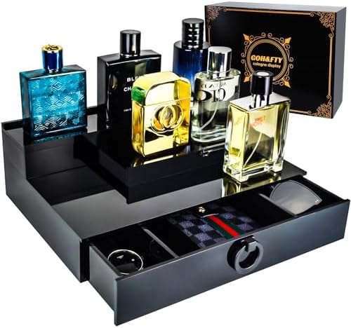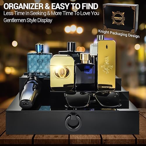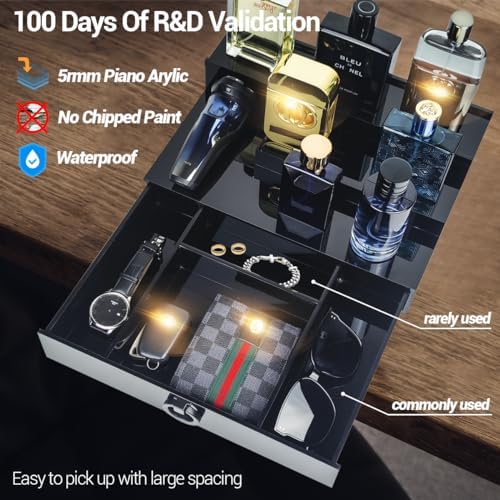 【🌟Innovative features】Cologne stand organizer for men cotain: 1. Hidden compartment 2. Easy access anti-drawer 3.Baffle design 4. Anti-slip mat.The hidden compartment effectively hides the money,jewellery, bank notes, coins, bank cards,watches, rings, bracelets and necklaces.Drawer for sunglasses,key, wallet, razors, phones,etc.