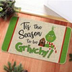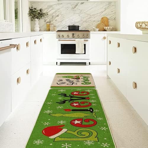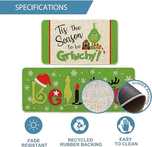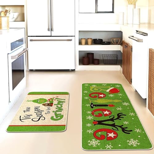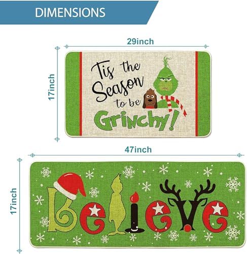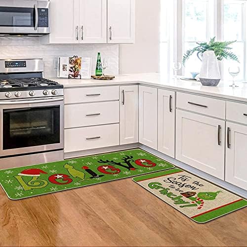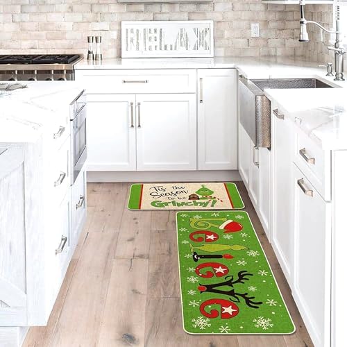Grinch Christmas Decorations Kitchen Rugs and Mats Set of 2, The Grinch Decor of Winter Holiday Party and Home Kitchen, Non-Slip, Washable, Stain and Fade Resistant, Size (17×30 and 17×47 inch)