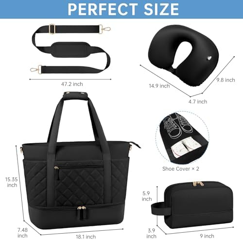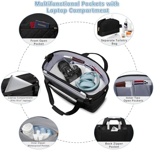 【MULTIPLE POCKETS FOR DIFFERENT NEEDS】: Our women weekender travel bag contains one main bag and one toiletry bag for you to place your toiletries or your makeup, one inflatable neck pillow. A functional compartment for 15.6″ laptop, A large front pocket for passport, 2 inner pockets so that you can place credit cards and ID, A large zippered waterproof pocket for wet clothes or towel,make it dry and wet separation, A back pocket for you to place your phone or tickets and others.