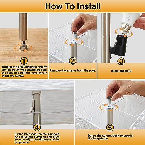 ✨【Attention】The base of this lamp is made of heavy solid wood, which means it won’t fall over easily and can hold well without loosening easily. The lampshade is made of folding cloth. Please take care with it and be sure to install the floor lamp following the instruction. Attach the white rod at the bottom of the inner lampshade to the buckle of the adjustable pole. And adjust the buckle up and down so as to adjust the tightness of the lampshade.