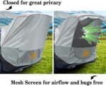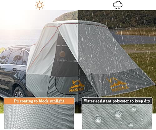 Sun protection and Waterproof:Made from 210T anti-slip polyester fabric,coated with silver PU and featured with 3000 MM waterproof rating,which means this awing tent can effectively block 90% of sunlight and keep you dry in the rain.Additionally,this car camping tent also includes 4 wind guy-lines and 2 stakes to ensure the stability even on the windy days.