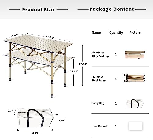 【Quick and Easy Setup】: No tools needed to install – simply unfold the aluminum frame, press the rails into the grooves, and press the table top into place. The painted aluminum table top is waterproof and easy to clean, with a special process that prevents fading and watermarks.