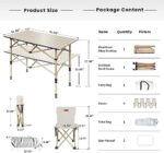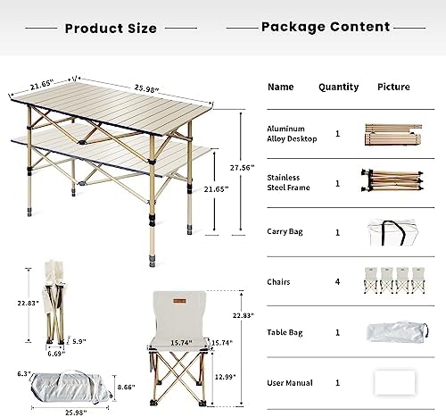 【Adjustable Height】: The height of this folding table can be adjusted from 21.65″ to 27.56″, making it very suitable for use on different terrains without the risk of tipping over. In addition, this table is equipped with 4 chairs, each of which can bear 330 lbs.