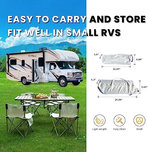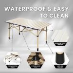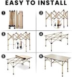 【Quick and Easy Setup】: No tools needed to install – simply unfold the aluminum frame, press the rails into the grooves, and press the table top into place. The painted aluminum table top is waterproof and easy to clean, with a special process that prevents fading and watermarks.