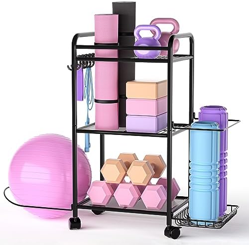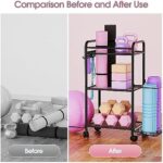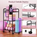 Lockable Wheels: This home gym storage organizer has 4 universal wheels and 2 of them are lockable. We specially to added a Yoga ball frame to organizer your yoga ball.