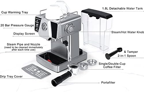 ☕[Classic Modern Look] This stainless-steel espresso machine is a great addition to modern kitchen. The cup warming tray on the top of can preheat the cups before brewing. With the large1.8L water tank, you can make more cups of coffee before needing to refill the tank, which saves time and effort.