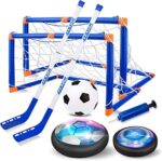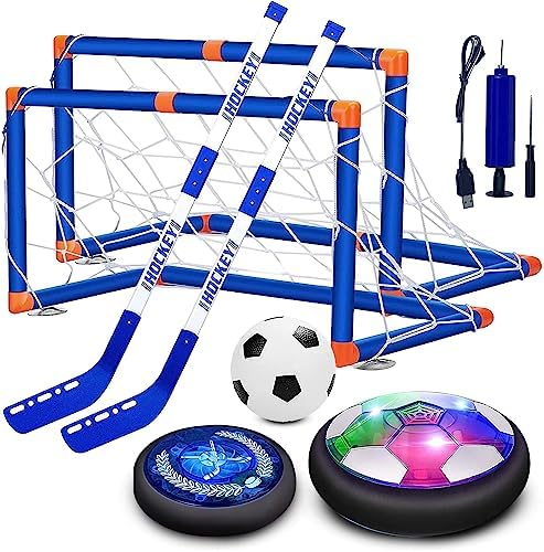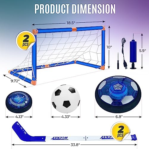 RECHARGABLE HOVER SOCCER BALL (A FANTASTIC KIDS TOY) Are you finding a toy that can keep your kids active in the house in those days the school closed, weekends, holidays? Our Hover Soccer Ball Set must be a great choice that can bring laughs to not only your kids but also your whole family. It’s PACKAGE Include: 1 rechargeable hover hockey 1 rechargeable hover soccer ball 2 goals 1 inflatable soccer 2 hockey sticks 1 charging cable.Help Teens to Enhance the Unity Power of Sports: Encourage teenagers to get exercise and strengthen their fine skills, like physical power training, sports spirit.USB Rechargeable Feature: This hover ball toy comes with a USB cable. You get rid of the trouble of install and replace the batteries. With powerful Built-in Motor creates good rebound for hours of fun.MAKE MORE FUN AT FAMILY PARTY / KIDS OUTDOOR SPORTS ACTIVITIES This Hover Soccer Game can be played in room, lawn, backyard, travel Or Camping. Adds unlimited fun to the family. Be Fun Anywhere!! Great Fun And Kids Play With Happiness. Throw the ball at the bowling pins, finish a great strike. Look no further for picnic games, camping games or travel games that will get you soccer at your kids and family. This hover ball costume is ideal for rainy days because it’s lightweight and easy to setup in a living room, backyard, or basement.Harmonious Parent-child relationship: Let children actively participate in physical exercise to improve the body’s immunity and keep your kids away from harmful electronic toys products. Great playtime with family. Improve Children Problems: (Bring happiness in children Life) Addicated to Mobile Phone Addicated to Video Game High Study Pressure Watching TV often feeling Depressed Children quarrel, fight and don’t get along well.