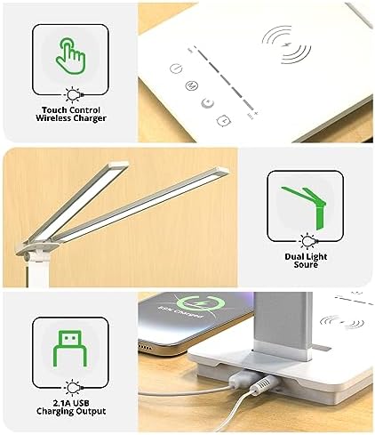 💡【10W Wireless Charger & USB Charging】 With a built-in wireless charging pad on the base, our desk lamp with USB charging port can charge Qi-compatible smartphones (requires 5V2A adapter, already included). The desk lamp with wireless charger clean up wire mess and saves you precious table space while working from home. The dual-head LED desk light not only offers a wider illumination area, but it will simultaneously juice up your two smart devices, too.