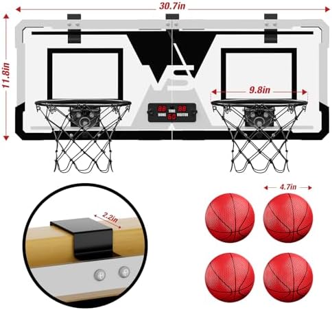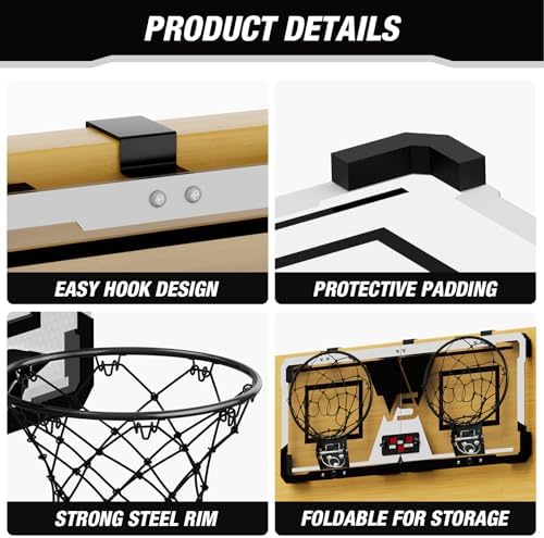 [Easy To Install & Foldable Design]- HYES 2 player mini basketball hoop comes with all the necessary tools and detailed manuals so that you could easily install and use it. Over the Door basketball hoop with easy hooks design, no need drilling and fits most doors. The perfect foldable design saves storage space, not affect opening and closing the door. Easy to carry to play outdoors.