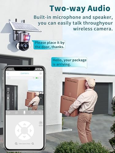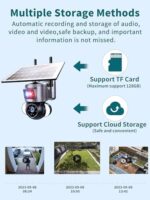 [🌧𝘼𝙙𝙫𝙖𝙣𝙘𝙚𝙙 𝙋𝙧𝙤𝙩𝙚𝙘𝙩𝙞𝙤𝙣, 𝙀𝙖𝙨𝙮 𝙎𝙚𝙩𝙪𝙥] Our solar security camera is designed for worry-free use in any weather (IP65 waterproof) and extreme temperatures (-4°F~122°F). Connect with 3 users for shared vigilance, ensuring your home’s safety even when you’re away. Installation is a breeze, with a high-gain antenna and 2.4GHz WiFi(no support 5G) for strong anti-interference. Store video or image on 128GB micro SD card (not included) or enjoy 7 days of cloud storage for trial.
