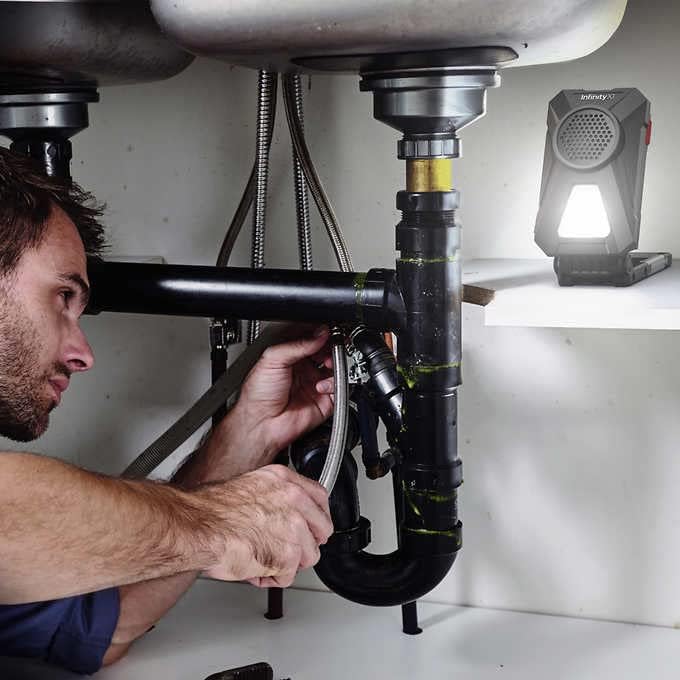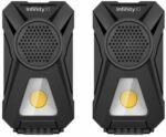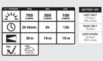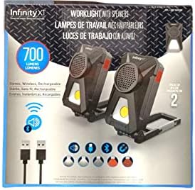 2xRechargeable Work Lights with Bluetooth Stereo Speakers. USB Charging Port. Speakers come with adjustable stands or can be set up on a magnetic surface. Lights have 3 settings with different battery life lengths , 700LM (2 1/2 hours), 300LM (5 Hours), 100LM (12 Hours).