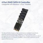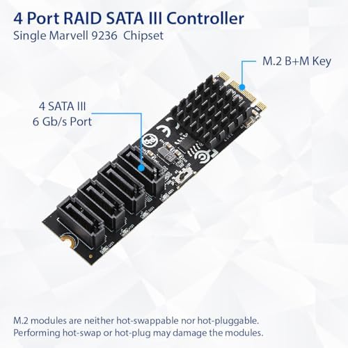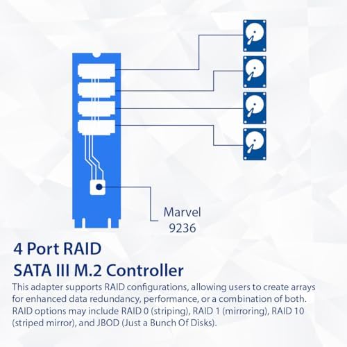 The 4-Port RAID SATA III to M.2 B+M Key Adapter is a versatile hardware solution designed to enhance storage capabilities within a computer system. Leveraging the Marvell 9236 chipset, this adapter provides support for up to four SATA III (6Gbps) connections with RAID. It interfaces with the host system via a PCI-e 3.0 x2 connection, delivering efficient and high-speed data transfer rates.