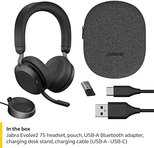 Home Office Products Office Electronic Products Jabra Evolve2 75 PC Wireless Headset with Charging Stand and 8-Mic Technology – Dual Foam Stereo Headphones with Advanced Active Noise Cancelling, USB-A Bluetooth Adapter and UC Compatibility – Black