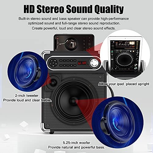 Multi-function Bluetooth Speaker: Built-in the latest Bluetooth 5.0 chip for wireless streaming ensures instant pairing and provides a more stable transmission and longer distance. This big speaker also supports a Micro TF card, Flash USB, and AUX-in connectivity. Compatible with the android mobile phone, TV, iPad, tablet, PC. There is a 6.35 microphone input on the operation panel, which also works for guitars. The unique groove design on the karaoke machine allows you to place your phone.
