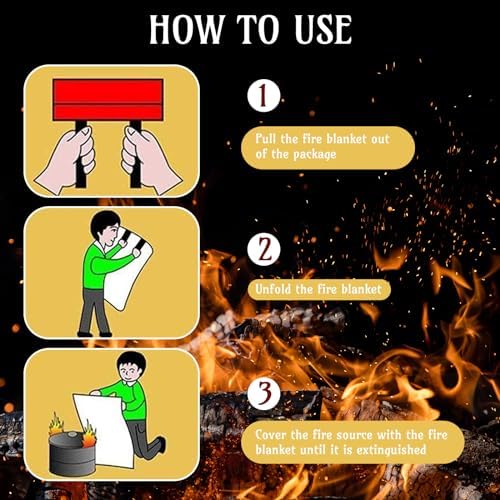 Easy to Use: simply pull down tabs on the fire blanket kitchen, spread the blanket wide and slowly cover the fire; Let the emergency fire blanket sit there for a few seconds to suffocate the fire, turn off the stove or any heat source