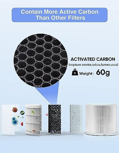 High-efficiency Activated Carbon for Odor: Activated Carbon filter decomposes unpleasant odors (litter box, cooking smells, etc.) in the air with 60% more activated carbon, performing better than average carbon filters.