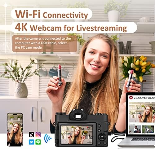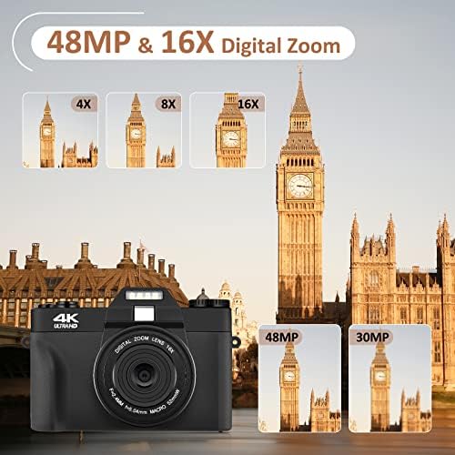 Vlogging Camera,4K Digital Camera for YouTube with 64GB SD Card 2 Batteries and Charging Stand Video Resolution: 4K 30fps / 2.7K 30fps / 1080P 60fps / 720P 120fps Image Resolution: 48M; 44M; 36M; 24M; 20M; 16M; 12M; 10M; 7M-Wide; 5M; 3M; 2M-Wide Memory Card: 64GB SD memory card included(Max to 128GB SD Card) Digital Zoom: 16X digital zoom (Support Autofocus) Auto Power Off: Off/3minute/5minutes/10minutes Display Screen: 3 inches 180 IPS Flip Screen ✔Autofocus: Support ✔Flash Light: Support (on/off) ✔Anti-shake: Support ✔Continuous Shooting: Support (on/off) ✔Slow Motion Record: Support ✔Time Lapse: Support ✔Self-timer: Support (2S/5S/10S) ✔White Balance: Auto/Daylight/Cloudy/Fluorescent /Tungsten ✔External microphone: Support (3.5mm jack) ✔ PC cam: Support ✔ Pause Function: Support ✔ HDMI Output: Support Package List 1*4K Digital Camera 1*64G SD card 1*Wide angle 1*Macro lens 1*USB data cable 2* Rechargeable Batteries 1*Double charge 1*Strap 1*User Manual