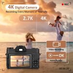📸【Photography Camera with Wide Angle & Macro Lens】The 4k digital camera equipped a dismantable wide angle lens with macro lens.wide angle lens is great for capturing wide horizons easily and With the included macro lens can magnify nearby subject for close-up photos.It was also equipped with anti-shake,continuous shooting,self-timer,and flexible capturing the shooting subject.With a knob on the top of the camera,you can switch between photos,video,time-lapse photography and other features.