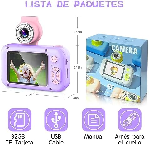 【Packing List】 1Pcs = 1*Kids camera+1* USB charging cable+1* 32GB TF card+1* User guide+1* Dual used stripe+1*Gift box package