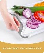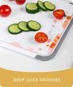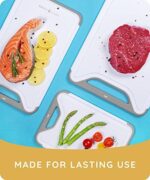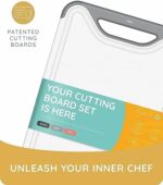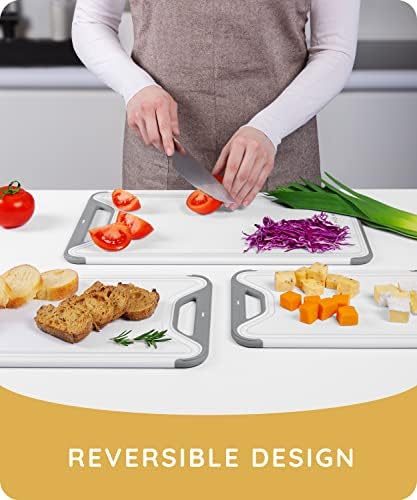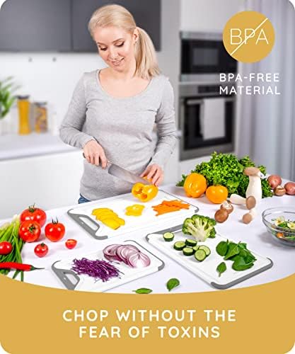 ✨ EASY TO USE! Plastic cutting boards for kitchen use feature deep grooved edges to collect of meat and fruit juices. No need to worry about splattering your counters when preparing and serving your favorite juicy foods with our cutting board set. Count on the long-lasting stability, dependable design, and impervious surface to scuffs and stains of our kitchen cutting board and show off your cooking skills to their fullest extent!