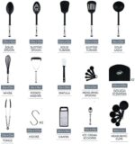 COOKING UTENSILS SET INCLUDES: Soup Ladle, Solid Spoon, Slotted Spoon, Solid Turner, Slotted Turner, Potato Pusher, Whisk, Grater, Spatula, Tongs, Ice scream Scooper, Measuring Cups, Measuring Spoons, 2 Dough Scrapers, 12 Hanging Hooks And a Beautiful Gift Box.