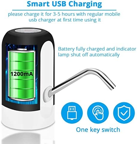 USB Rechargeable Battery: Built in rechargeable battery. Can used for 30-40 days or around 4-6 bottles of 5 gallon water once full charged. No need to charge every day.