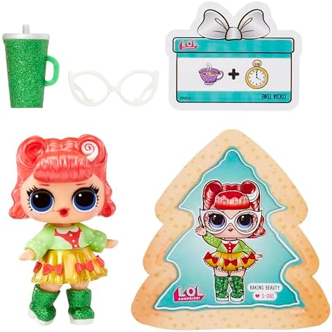 Introducing L.O.L. Surprise! Holiday Surprise- Baking Beauty! Baking Beauty is ready to celebrate her favorite winter holidays in style! Both Baking Beauty and Miss Merry love gift shopping for their besties, sipping hot cocoa, and making snow angels! Baking Beauty is ready to ring in the new year in glittery style with sparkling fashions, shoes, bottle, accessories, ornament ball, sticker, and secret message! Baking Beauty comes with a water surprise! Will yours spit, cry, or tinkle? Feed them to find out! Includes: (1) 1 Limited edition L.O.L. Surprise! Holiday Present Surprise doll; (2) Outfit; (3) Shoes; (4) Bottle; (5) Accessory; (6) Sticker; (7) Secret Message; (8) Ornament Ball. LOL Surprise collectible dolls with stylish hair, fun to dress outfits and many detailed accessory pieces make a perfect toy and playset for kids including 4- to 7-year-olds and up girls and boys for imaginative pretend play! As birthday gifts and gift for any special occasion, dolls provide hours of social play with siblings and friends! From MGA Entertainment, creators of LOL Surprise fashion and collectible dolls, Rainbow High fashion dolls, Na Na Na Surprise dolls, Bratz fashion dolls, MGA’s Dream Ella fashion dolls, MGA’s Glitter Babyz baby dolls, Lalaloopsy, Poopsie Surprise girls dolls, Baby Born Surprise Baby Dolls and Collectibles, Little Tikes kids toys and many other favorite brands.