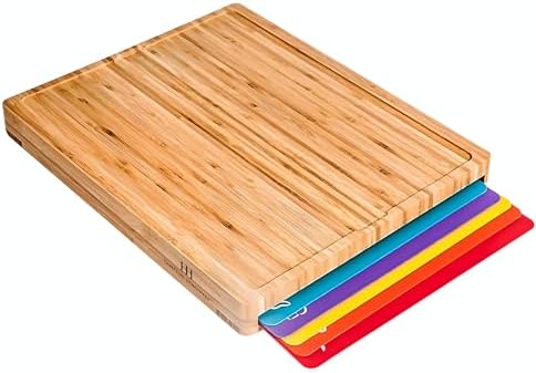 CULINARY EFFICIENCY – Crafted from sustainable organic bamboo, the cutting board provides a durable and stylish surface for all your food preparation needs. The color-coded mats offer a hygienic and organized system, ensuring easy differentiation between ingredients and preventing cross-contamination.