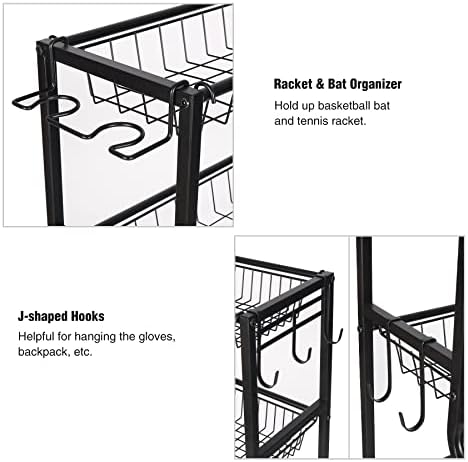 【Large Capacity】This ball storage garage features 2 basketball storage bin and 4 long metal mesh baskets, which can store kinds of sports equipment. With a a racket & bat oranizer and many J-shaped hooks, provides more storage space, makes your things well-organized.