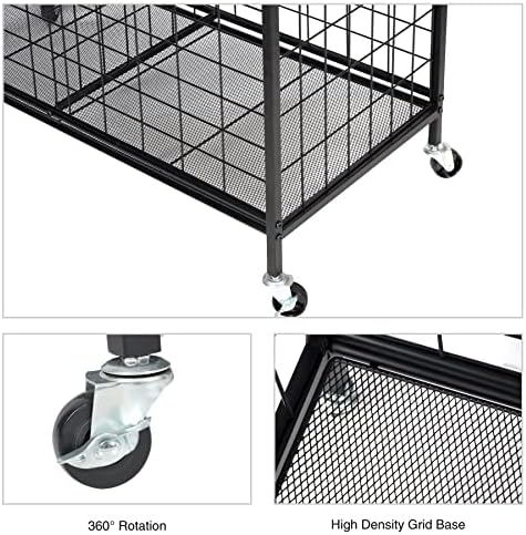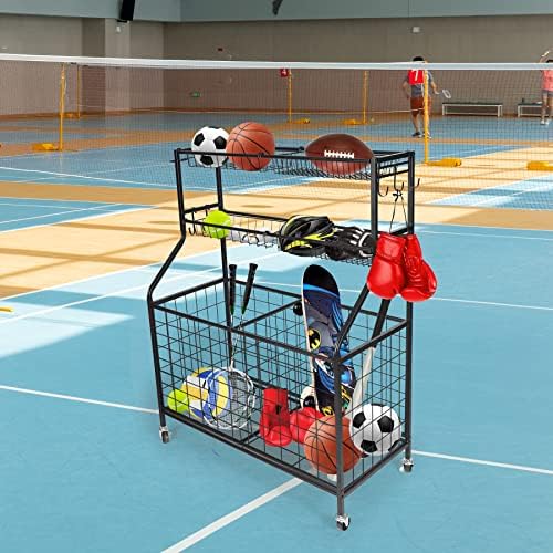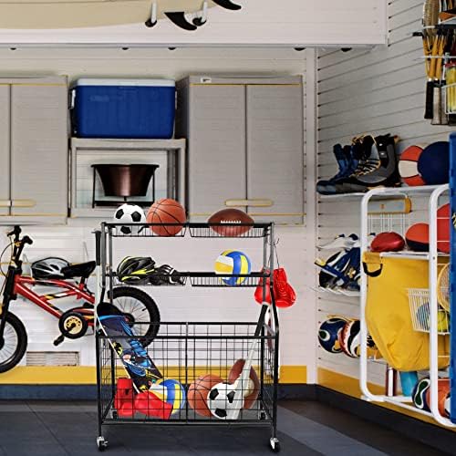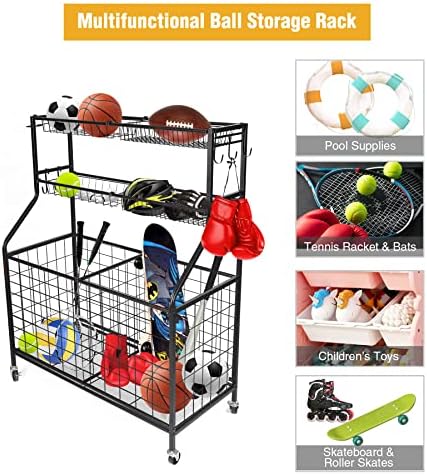 Lineslife Garage Sports Equipment Organizer with Baskets and Hooks, Ball Storage Rack on Wheels, Sports Ball Gear Rack for School, Gym, Playground, Black