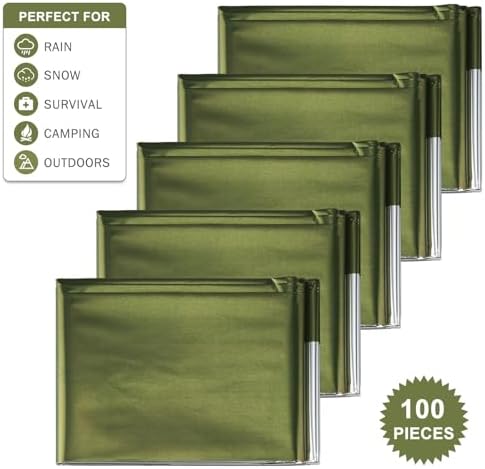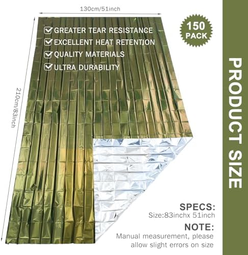 Macarrie 150 Pack Emergency Thermal Blankets Silver Foil Survival Blanket Space Blanket Survival Kit for Outdoors, Camping, Hiking, Homeless, Survival or First Aid, Army Green