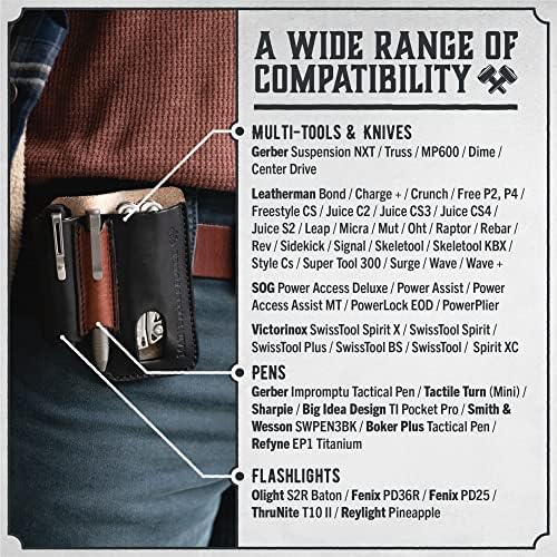 Compatible with the most Popular Leatherman, Gerber & SOG Multitools! Known to fit all of your favorite multi tools like the Leatherman Wave, Free P2 / P4, Charge, Rebar & Signal, Gerber Truss & SOG PowerAssist & PowerPint and virtually any standard size tools or knives.