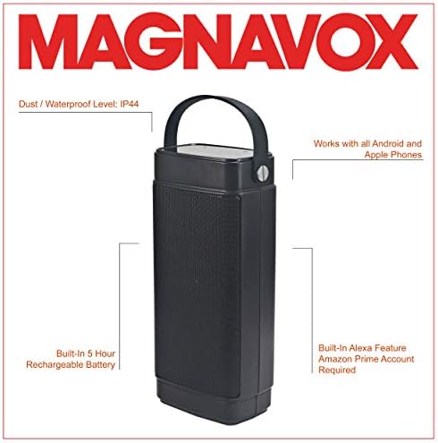 Magnavox celebrating 100 years of sound and visual Quality. The Magnavox brand originates back to 1917 when the Worldâs first moving coil speaker was invented in a lab in Napa, California. Due to this invention for the first time in human history the world witnessed a human voice that could be heard by an entire town. The product was named: Magnavox ~ Latin for âGreat Voiceâ. It became a prime piece of US history and the foundation of a trusted brand for almost a century linked to dozens of notable achievements such as the first game console (Magnavox Odyssey) as well as Worldâs first plasma computer panels. Throughout the years Magnavoxâs visual appearance took several forms relevant to its time. Ranging from multiple revisions of its initial appearance (the historic great voice featuring a lionâs head), a shield covering the history of the brand and its influence on entertainment, into a contemporary wordmark in 1982 and the wordmark it is today. The popularity of the Magnavox brand is as strong as ever before and its remarkable history attracts many fans and non-profit organizations. Accessories Included: Works with iPhones, Android smartphones and tablets Total 3W RMS output Dust protection / Waterproof level: IP44 Touch sensor control panel Connect to any audio device via 3.5mm aux in port Built-in 5 hours rechargeable battery Just talk and ask for music from Prime Music, iHeartRadio, and TuneIn Uses the Alexa Voice Service when connected to mobile with Bluetooth to play music, read the news, provide weather reports, and even order a pizza Amazon Prime account is required to play music Android / iPhone APP is required 4G or Wifi network (internet connection) on smartphone/tablet is required USB charging cable 3.5mm aux in connection cable