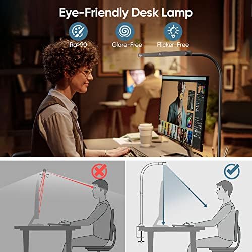 ✅【No Screen Glare & Adjustable Desk Lamp】Equipped with 45° angled away LEDs and side lighting design, it illuminates only your desk and keyboard, no reflected glare on the screen or in eyes,NO flickering,reducing eye fatigue.Maneuver your desk lighting to fit your workspace with the durable and flexible silicone neck. This clamp light uses minimal space and fits desks up to 2.5 inches.