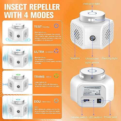 【Four Functions Switch】This ultrasonic mouse repellent can be manually adjusted with 4 modes to achieve the desired effect. No need to buy various products for different kinds of pests. TEST = Test tone (simulates the sound heard by rodents to check if the device works). ULTRA = Ultrasonic (22kHZ-35kHZ effectively repels mice and rodents). TRANS = pressure wave (25kHZ is effective at repelling squirrels). DUO = Pressure Waves + Ultrasonic (rejects all pests, rodents, and insects)