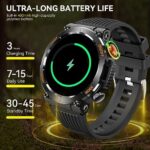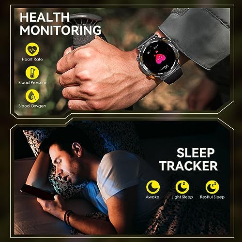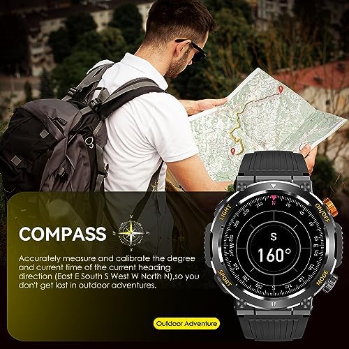 【Military Smartwatch with LED Flashlight】- Bassizo military smart watch for men uses innovative technology to equip a flashlight on the side of the watch, so you will no longer be afraid of the dark, designed for outdoor sports! Meanwhile, Bassizo smart watch for men is equipped with a 450 mAh extra-large battery, which ensures the ultra-long battery life of the watch, it only needs to be fully charged within 2 hours and can be used for 6-7 days, and the standby time is about 20 days!