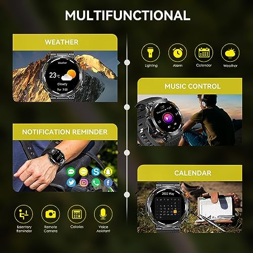 【Multifunctional Waterproof Smartwatch】- Bassizo men’s tactical smartwatch also offers many useful functions such as a calculator function, weather forecast, music player, alarm clock, and more. It also features a wrist lift to light up the screen, call alert, SMS alert, alarm reminder, shake to take a photo, phone search, and more. In addition, Bassizo waterproof smartwatch has no problem washing its hands and jogging in the rain (but does not support swimming, diving, showering/sauna, etc.).