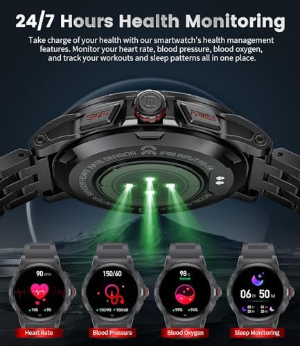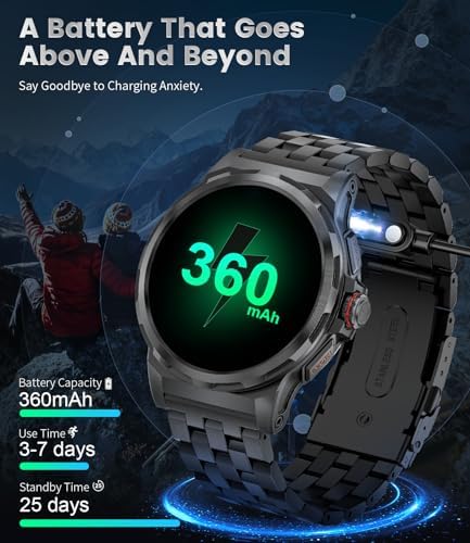 🎖️MILITARY-GRADE CERTIFIED ALL-METAL ENCLOSURE SMARTWATCH-This rugged military smart watch boasts 12 outstanding certifications: shock resistance, extreme temperatures, IP68 waterproof, dust-proof etc. The solid steel bracelet and folding safety buckle are made of 304 stainless steel and its unique metal case and composite construction ensures durability. This tactical smart watch for men were created especially for outdoor enthusiasts and are waterproof, shockproof, and dustproof.