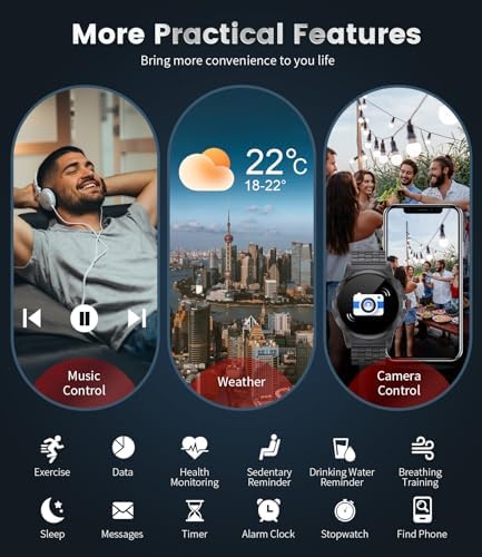⌚ 100+ DIY DIALS&SUPER LONG BATTERY LIFE-Over 100 kinds of dials for you to choose from, you can even customize your colour and style to show your personality. This iOS android smart watch comes with a 360mAh large battery that provides up to 7-10 days of usage and an incredible 30 days of standby time, and takes only 2 hours to charge. The men’s smartwatch has a variety of useful functions such as alarm clock, stopwatch, music/camera control, weather, torch, find your phone and more.